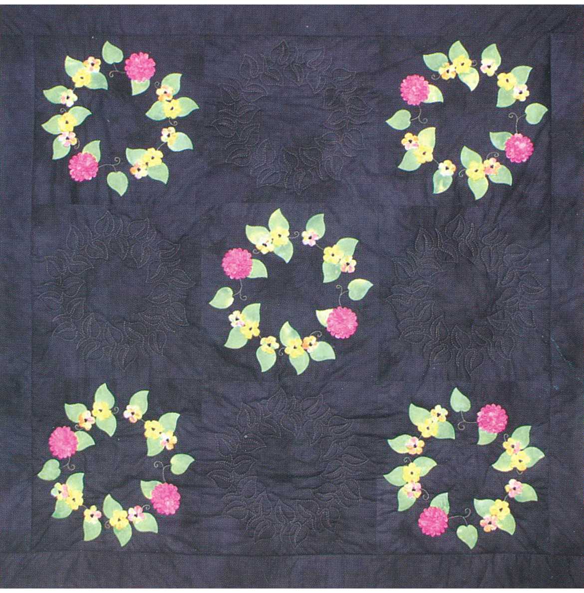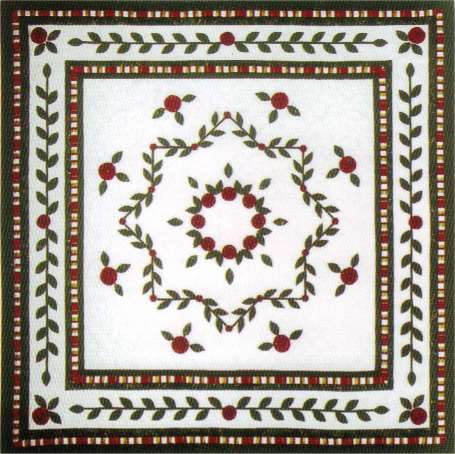 Fine appliqué embellished with yo yo berries that utilize the TC300 Piecing Pal Circle Guide by Quilting Creations International. Complete instructions make completing the single block wall quilt or four block throw easy and fun. Suggested Quilting Stencil: EL80 Jacobean Border from Quilting Creations International.