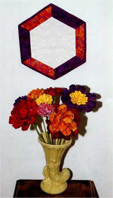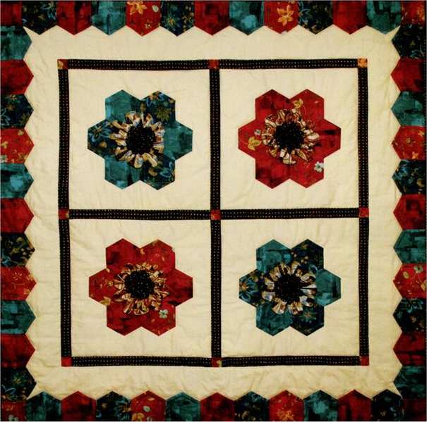 Complete instructions are included for the Hexagon flowers that are embellished with Jumbo coin rushed centers. The border is pieced, then appliqued.