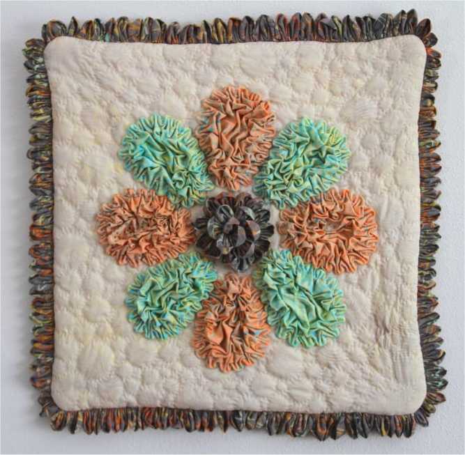 binding can be cut from 21/2" strips. Ruched Blossom centers utilized the Piecing