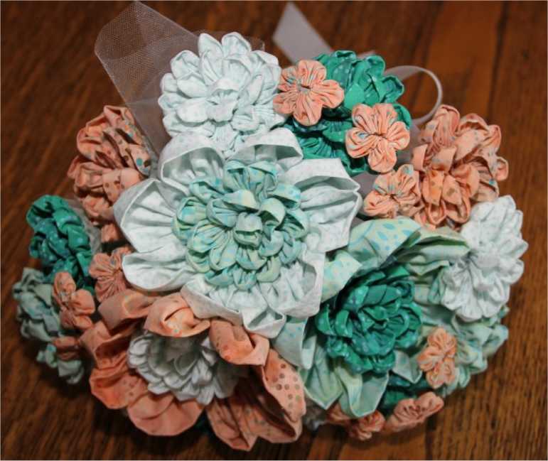 Complete instructions for dimensional Dahlia Blossoms utilizing Piecing Pals Heart Guide THT700 and Coin Ruched Blossom Guide TR600 available from Quilting Creations