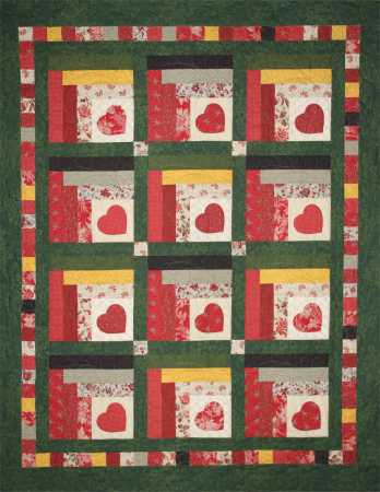 Pieced log cabin blocks are 2 1/2 inch strip friendly. Heart appliques may be done by hand or machine.