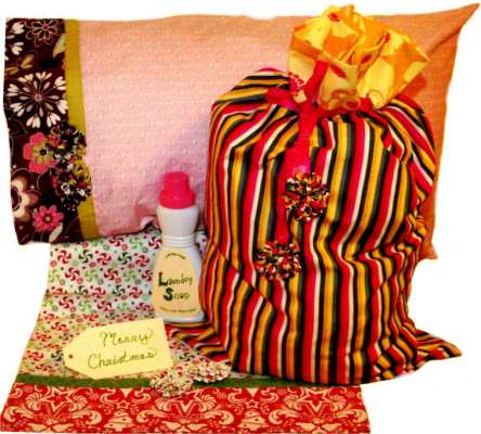 Cover pillows, wrap gifts or tote your laundry in style. Coin ruched embellishment finish the fabric ties. Sizes: Infant Standard and Queen