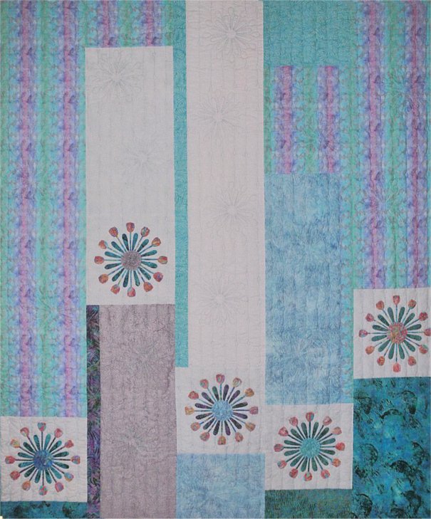 Five dimensional applique blocks splash down in this modern style throw size quilt. With lots of space for modern quilting, this quilt will enhance any décor.